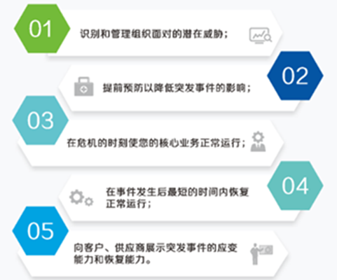 ISO 22301业务连续性管理体系,能够帮助企业制定一套一体化的管理流程计划,使企业对潜在的灾难加以辨别分析,帮助其确定可能发生的冲击对企业运作造成的威胁,并提供一个有效的管理机制来阻止或抵消这些威胁,减少灾难事件给企业带来损失。