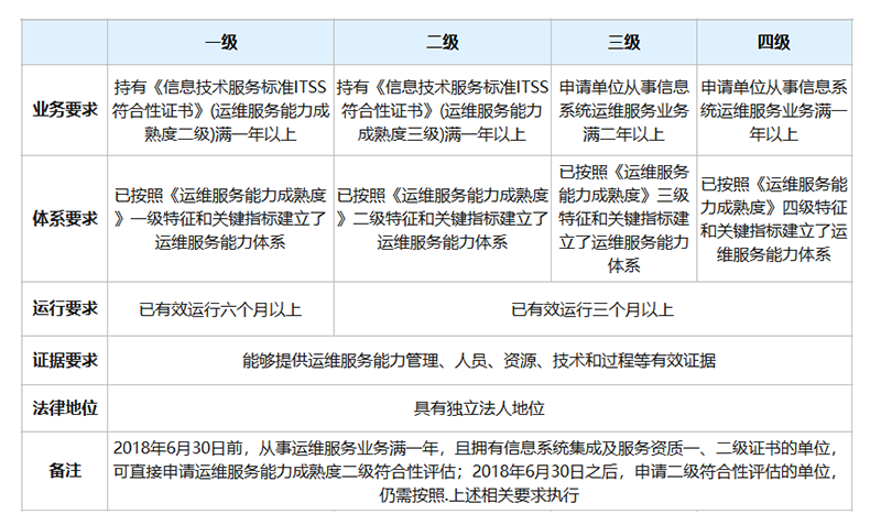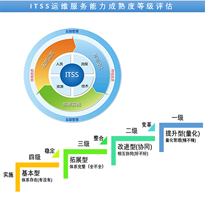 ITSS运维服务能力成熟度模型的建立参考了信息技术服务领域有关成熟度的各类模型,它是反映运维服务能力水平的框架。该模型按运维服务组织能力建设和管理定义了逐步进化的四个等级,自低向高分别为基本级、拓展级、改进(协同)级和提升(量化)级,分别对应四级、三级、二级和一级。